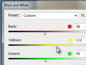 Kliknite zgoraj na Image, Adjustments in izberite Black and White... V novem oknu se poigrajte z barvnimi drsniki in kliknite na gumb OK, ko boste zadovoljni. Jaz sem nastavljal večinoma rumeno barvo, saj ima tovornjak podobne barve. |