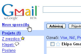 Kliknite na povezavo Novo sporočilo in ustvarite vaše prvo e-sporočilo znotraj Gmail-a. |