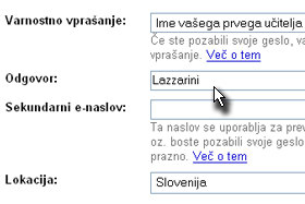 Jaz sem izbral Ime vašega prvega učitelja, saj bom v primeru pozabljenega gesla odgovor na to vprašanje znal na pamet. V polje odgovor vpišite še odgovor na zgornje vprašanje. Sekundarni e-naslov lahko pustite tudi na miru. Lokacija naj bo določena Slovenija. |
