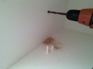 Najprej sem zvrtal luknjo na steni obeh omar.