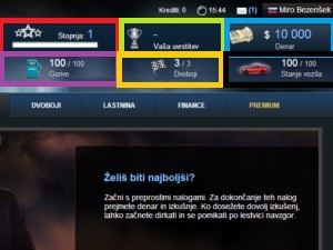 1.Stopnja-pove nam kateri level smo in s vsako stopnjo imamo več možnosti za nove dodatke. Prikazuje tudi koliko imamo izkušenj(rdeča barva). 2.Lestvica-Z dvoboji proti ostalimi igralci boste napredovali po lestvici. Dvoboji se vam odklenejo ko boste stopnja 3(zelena barva). 3.Denar-Z denarjem lahko kupujete nove avte, opremo za avte, spretnosti in objekte(modra barva). 4.Gorivo-Potrebujete ga za opravljanje nalog, dvoboje... Gorivo se samodejno polni na približno vsake 3 minute(vijolična barva). 5.Dvoboji-Na začetku imate na voljo 3 dvoboje, kasneje jih lahko povečate. Tudi dvoboji se polnijo na vsakih 5 minut(oranža barva). 6.Vozilo-Kaže nam kakšno je stanje vozila, ob izgubi dvoboja se stanje poslabša. Stanje se samodejno polni(črna barva).