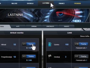 1.Tukaj lahko nadgradimo svoj avto tako da mu povečamo hitrost, pospeševanje in upravljanje s klikom na gumb treniraj. 2.Povečamo lahko tudi limite(gorivo,dvoboje ali stanje vozila), s klikom na povečaj. V zavihku lastnina lahko tudi kupimo nov avto s klikom na Avti, ali pa si ga poboljšamo s klikom na oprema, spretnosti ali objekti.