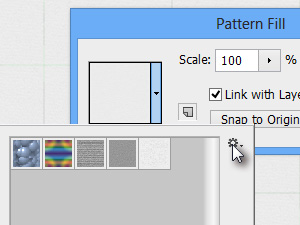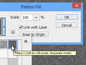 Kliknite na Layer, New Fill Layer in izberite Pattern Fill... Ko se vam prikaže okno za potrditev imena za nastavitveni layer, kliknite na gumb OK. Potem pa v novem oknu kliknite na izbirnik vzorcev, nato na možnosti (glej sliko) ter izberite Greyscale paper. Ko vas Photoshop vpraša, ali želite dodati ali zamenjati vzorce, kliknite na gumb OK.
