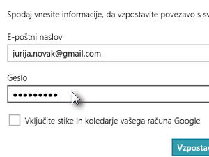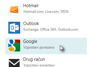 Lahko označite tudi možnost Vključite stike in koledarje vašega računa Google, če želite da se z njimi Windows 8 poveže.