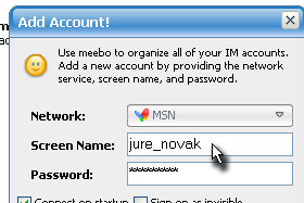 Jaz uporabljam MSN Messenger, zato sem izbral MSN. V polje Screen Name vpišite ime in geslo, ki ga uporabljate za izbrano omrežje. Jaz sem vpisal uporabniško ime in geslo MSN messengerja. Kliknite na gumb Add new connection. |