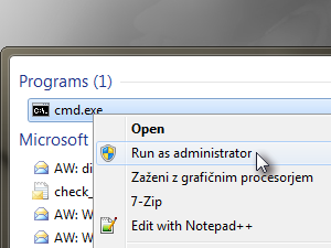 Med najdenimi rezultati z desnim miškinim gumbom kliknite na cmd.exe in izberite možnost Zaženi kot skrbnik