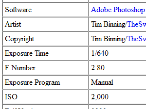 ![]() Najdemo pa tudi veliko drugih podatkov, od avtorja slike (Artist), do nastavitev fotoaparata pri zajemu slike (Exposure time, F Number) ter še mnogo drugih zanimivih podatkov. |
