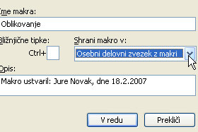 V polje Ime makra vpišite poljubno ime, ki ne vsebuje presledkov. Potam pa v polju Shrani makro določite preko izbirnika Osebni delovni zvezek z makri. To pomeni, da bo makro deloval tudi v drugih delovnih zvezkih. Klikniten a gumb V redu. |