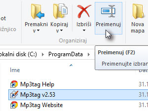 Datoteko sem pustil označeno ter kliknil na gumb Preimenuj. Lahko pa bi enostavno uporabil bližnjico s tipko F2.