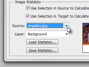 ![]() Match Color okno mi pokaže več možnosti, vendar sem najprej označila Source fotografijo, iz katere žleim kopirati barvo majice. |