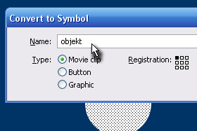 Pojavi se okno Convert to Symbol. V polje Name vpišite objekt, Type določite Movie clip. Kliknite na gumb OK. |