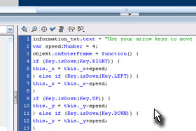 Vpišite naslednjo kodo: information_txt.text = "Use your arrow keys to move the balloon!"; var speed:Number = 4; objekt.onEnterFrame = function() { if (Key.isDown(Key.RIGHT)) { this._x = this._x+speed; } else if (Key.isDown(Key.LEFT)) { this._x = this._x-speed; } if (Key.isDown(Key.UP)) { this._y = this._y-speed; } else if (Key.isDown(Key.DOWN)) { this._y = this._y+speed; } }; |
