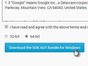![]() Izberite 32-bitni ali 64-bitni sistem. V mojem primeru je to 64-bitni sistem. Če ne veste kateri bitni sistem imate pritisnite Start -> Nadzorna plošča -> Sistem in varnost -> Sistem -> Vrsta sistema. Obkljukajte, da se strinjate s pogoji uporabe in kliknite Download the SDK ADT Bundle for Windows. Dodateka je precej velika (400 MB) in bo najverjetneje potrebovala dolgo časa za prenos.