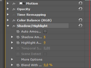 V zavihku Effects poiščite Shadow/Highlight, ter ga povlecite v Timeline, kot v 3. koraku in nastavite parametre, kakor so na sliki.