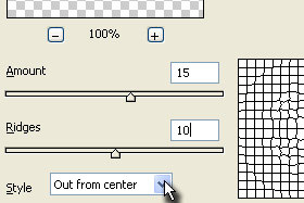 Ko vas program vpraša, ali naj layer resterzirira, potrdite na gumb OK. Pojavi se okno za nastavljanje. Amount določite 15, Ridges 10 in Style preko izbirnika določite Out from the center. Kliknite na gumb OK. |