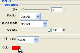 Odpre se okno Layer Style. Size nastavite 8 px. Kliknite na kvadratek za določanje barve (glej sliko). Pojavi se okno za določanje barve. V polje # vpišite vrednost ffffff in kliknite na gumb OK. Ne zaprite še okna Layer Style... |