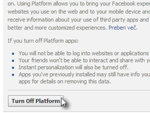 Tukaj kliknemo Turn off platform in s tem smo aplikacije izključili.