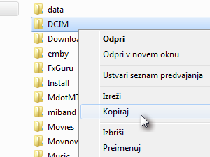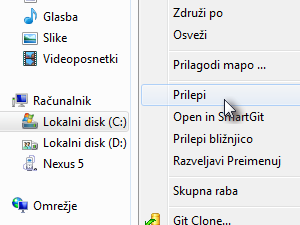 ![]() Nato se v Raziskovalcu postavite v poljubno mapo na vašem računalniku, kliknite nanjo z desnim miškinim gumbom, ter izberite možnost Prilepi. Datoteke se bodo tako sedaj prekopirale na trdi disk vašega računalnika. |