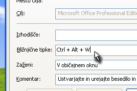 Kliknite z miško v polje Bližnjične tipke (glej sliko).