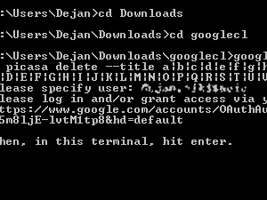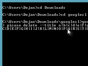 picasa delete --title a|b|c|d|e|f|g|h|i|j|k|l|m|n|o|p|q|r|s|t|u|v |w|x|y|z|A|B|C|D|E|F|G|H|I|J|K|L|M| N|O|P|Q|R|S|T|U|V |W|X|Y|Z|0|1|2|3|4|5|6|7|8|9 Vse skupaj mora biti v eni vrstici.