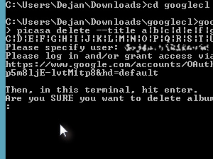 Google ukazni poziv vas bo vprašal, če želite pobrisati prvi album, kjer potrdite s tipko y ter Enter.