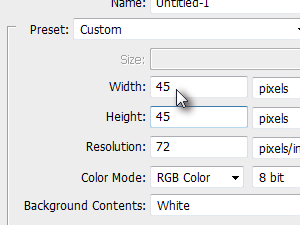 Nato pa v programu kliknil zgoraj na File in izbral New... V novem oknu nato določil dimenzije sličice, ki predstavljajo 45 x 45 pik ter potrdil s klikom na gumb OK. |