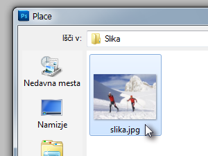 V oknu z raziskovalcem sem nato poiskal in označil sliko, katero želim dodati in kliknil na gumb Place. |