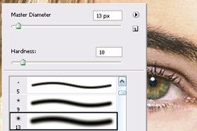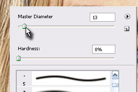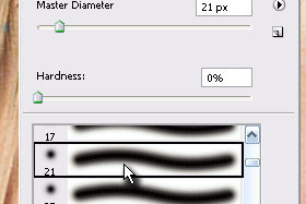 Kliknite z desnim miškinim gumbom na sliko in določite tokrat večji Master Diameter in Hardness nastavite 0%. Jaz sem določil Master Diameter 21 px. Pritisnite tipko ESC, da zaprete okno. |