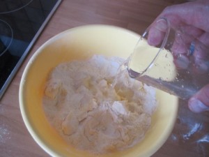 Potem pa začnite z roko gnesti vse skupaj in vmes dodajajte toplo vodo, da boste ustvarili ne preveč lepljivo in ne preveč suho maso za tortilje. |