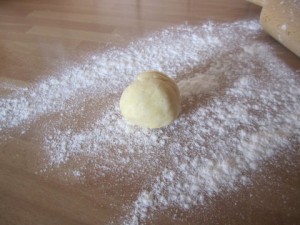 Po tem času naredite osem kroglic iz pripravljene mase in nato eno postavite na pomokano površino. |
