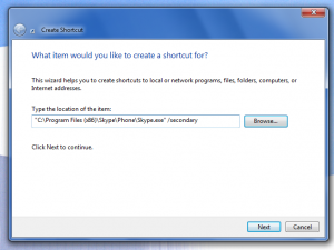 Pot izgleda nakako tako: "C:\Program Files (x86)\Skype\Phone\Skype.exe" /secondary Kliknite Naprej.