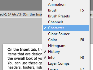 ![]() V kolikor še nimamo prikazanega okno Character, ga vklopimo preko menija Windows. |