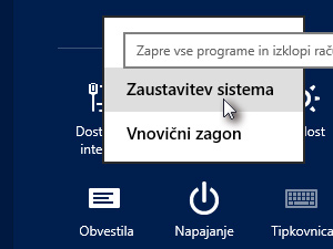 Na začetnem zaslonu se morate postaviti z miško v desni zgornji ali spodnji kot in nato izbrati Napajanje ter nato zaustavitev sistema. Mogoče se sliši enostavno, vendar ni :)