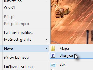 Postavite se na namizje, kliknite nanj z desnim miškinim gumbom, izberite Novo ter Bližnjica.