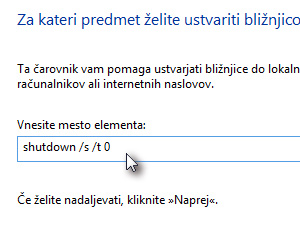 V novem oknu v polje mesto elementa vnesite shutdown /s /t 0 in kliknite Naprej.