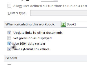 ![]() In v polju When calculating this workbook označite Use 1904 date system (glej sliko). Potrdite vse spremembe s kliki na gumb OK. |
