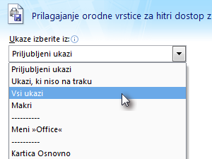 ![]() V meniju izberite poljubno funkcijo, ki jo želite dodati v vrstico za hitri zagon. |