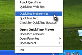 Spodaj, desno pri uri, bomo videli novo ikonco od programa. Kliknite nanjo z desnim gumbom na miški in izberite QuickTime Preferences.