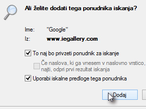 Ko vas program vpraša za nastavitve, označite To naj bo privzeti ponudnik za iskanje in kliknite na gumb Dodaj.