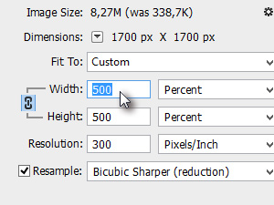 V novem oknu najprej določite Percent na desni strani, nato pa določite 500 v polje Width.