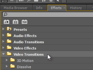 Sedaj odprite zavihek Effects tab in nato Video Transitions, ...