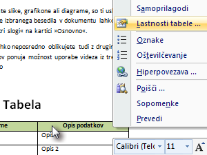 Kliknemo z desnim miškinim gumbom in izberemo možnost Lastnosti tabele. |