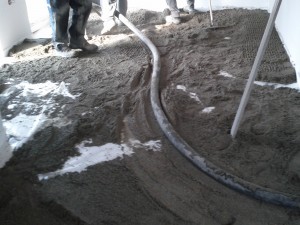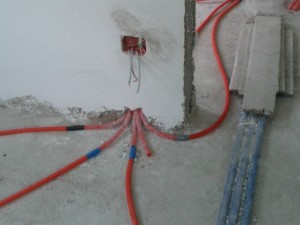 Tipična situacija pred polaganjem estriha je, da imamo po tleh napeljane cevi za elektriko in vodo.