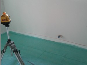 ![]() Pred polaganjem se s pomočjo posebne laserske naprave, ki se sama avtomatsko poravna vodoravno, po stenah označi ustrezno višino, tako da bo višina estriha povsod enaka. |