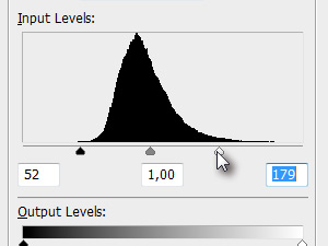 Pritisnite tipki Ctrl (Command na MacOS) + L, da odprete okno Levels in nastavite črni in beli drsnik proti sivemu na sredini (glej sliko).