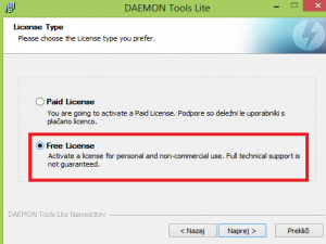 Pri naslednjem koraku izberemo Free License in kliknemo Naprej.