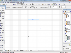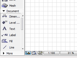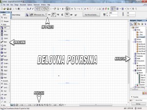 ORODJARNA: (Tool box) prikazuje orodja za oznaაevanje (SELECT) modeliranje (DESIGN), risanje (DOCUMENT) in dodatna orodja (MORE). INFO PALETA: (Info box) prikazuje lastnosti izbranega orodja v Orodjarni. Prvi gumb z leve prikaže nastavitve aktivnega orodja. Do nastavitev orodja lahko pridemo tudi z dvoklikom na želeno orodje v Orodjarni. NAVIGATOR: prikazuje bližnjice do etaž (Stories), prerezov (Sections), detajlov (Details), Sezname (Lists) … POVEČAVA: se nahaja na dnu vsakega okna, prikazuje pa: