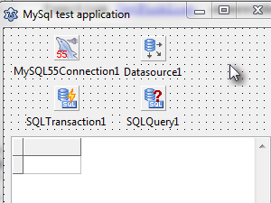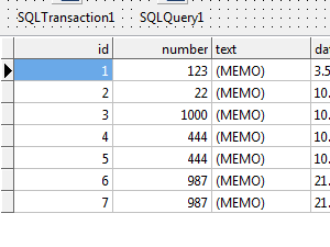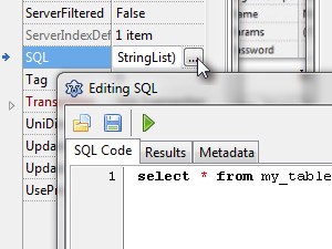 Nastavite naslednje parametre: Database na MySql55Connection1. Transaction na SQLTransaction1. Sedaj kliknite lastnost SQL. Odprlo se vam bo okno, kjer boste lahko vpisali poljuben SQL stavek. V mojem primeru je to select * from mytable, ki bo izpisal vse podatke iz tabele my_table. Na koncu še nastavite vrednost Connected na True. |