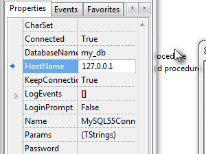 Nastavite naslednje parametre: HostName - IP naslov MySql strežnika Username in Password - uporabniško ime in geslo MySql strežnika DatabaseName - ime baze na MySql strežniku Na koncu še nastavite vrednost Connected na True. |