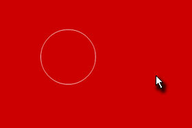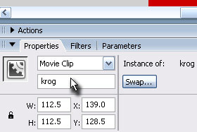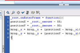 Vpišite naslednjo skripto: _root.onEnterFrame = function(){ positionX = _root._xmouse - 55; positionY = _root._ymouse - 50; krog._x = krog._x + (positionX - krog._x)/15 krog._y = krog._y + (positionY - krog._y)/15 } |